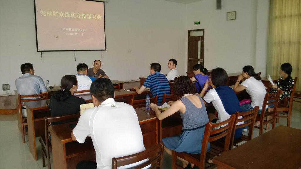 本次专题学习会由体军部直属党支部支委委员姚智勇同志主持,学习会分为两个阶段。第一阶段就群众路线的基本涵义、历史发展和地位及作用进行了学习。第二阶段通过观看由中央党校马克思主义理论教研部陈冬生教授关于《党的群众路线再回顾》视频资料,重点从“鱼水论”、“血肉论”、“以人为本”三个阶段对党的群众路线的发展历程做了简单的概况,并对历史上苏共等六大执政共产党丧失执政地位的历史教训做了总结。