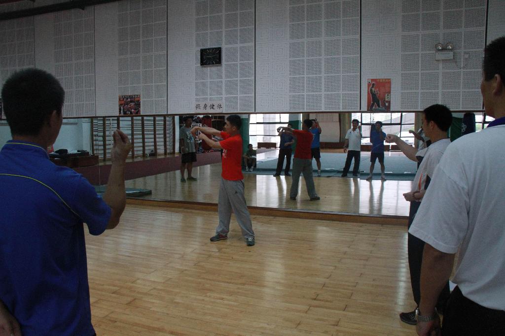 在前期的精心准备下,2013年9月24日下午1:30,体军部如期召开了主题为“体育基础课教学研讨”校级教研活动,主要内容是以探讨一年级武术、健美操教学内容、教学评价为主,主要形式是以集体讨论、集体备课、集体学习为主。参加人员由体军部全体教师组成。整个活动由叶东惠老师主持,姚智勇、应昌达两位老师具体负责实施。具体活动分为两个部分:理论引导、实践演练。活动地点分别安排在:体育馆贵宾室、体育舞蹈房、武术房。