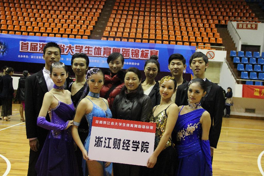 2012年12月1日至3日,由浙江省教育厅主办、浙江师范大学承办的“首届浙江省大学生体育舞蹈锦标赛”在浙江师范大学体育馆举行,本次大赛甲组共有来自15所高校104位运动员参加。我校体育舞蹈队在教练王兵老师的带领下,共派出四对运动员参赛,他们分别是卢劭炜、王婷,林伟健、居然,王康佳、张栋琳,叶冠成和王玉琪;其中卢劭炜和王婷同学取得甲组恰恰第五名的佳绩,林伟健和居然同学获甲组探戈第六、华尔兹第八名的好成绩!