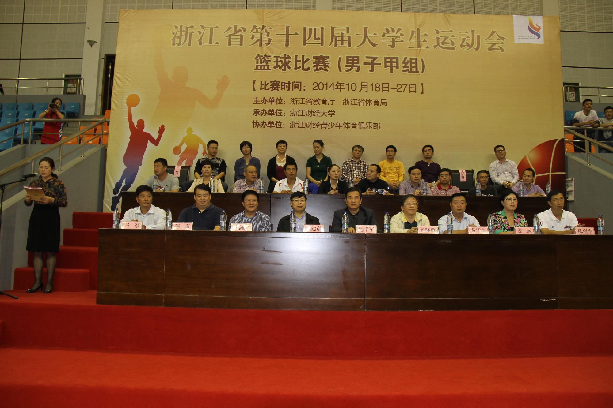 10月19日晚上6点半,由我校承办的浙江省第十四届大学生运动会篮球比赛(男子甲组)在我校体育馆举行了开幕式。浙江省教育工委副书记、浙江省教育厅副厅长、浙江省大学生体育协会主席鲍学军,浙江财经大学副校长、浙江省大学生体育协会副主席钟晓敏,浙江省体卫艺处处长李建章,浙江省大学生体育协会秘书长徐剑津、副秘书长姜丽,浙江省大学生体育协会篮球分会主席薛岚、副主席陈南生。浙江省大学生体育协会竞赛部主任赵军出席了开幕式。开幕式由我校体军部主任叶东惠主持。