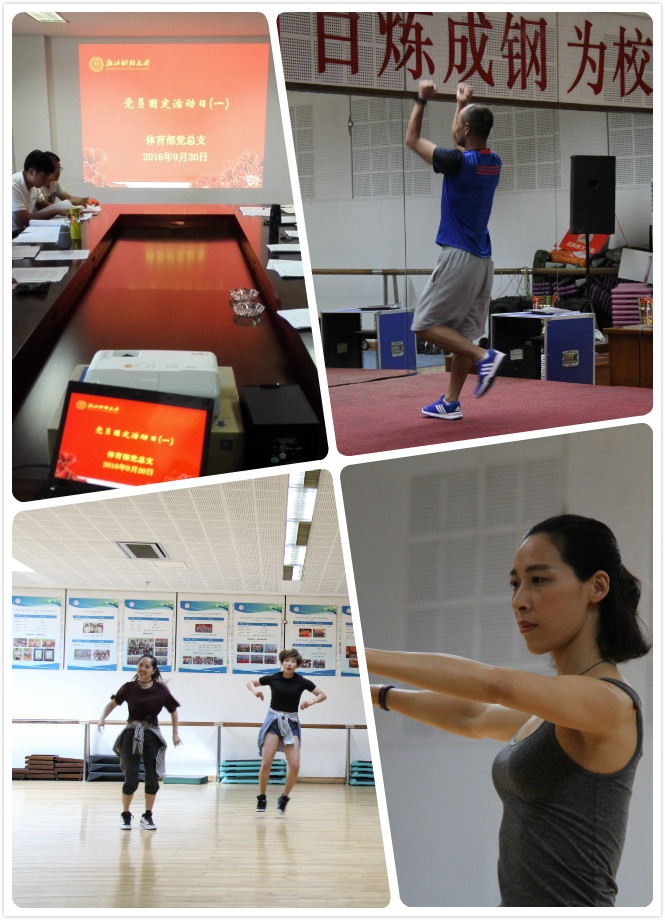 活动在团结紧张,严肃活泼的气氛中进行。首先由第一党支部书记姚智勇老师带领健美操教研组展示了健美操的技能,通过完整展示整套动作、分解剖析动作重点、难点等方式对健美操课程教学过程加以规范并统一了考核标准;随后,暑期外出参加全国健美操培训的几位老师(党员:姚智勇、佀慧、杨蓓蓓、吴艳)分别展示了外出学习成果,同时将在外学习所取得的收获和心得体会与大家做了分享,使大家进一步了解到了当前的健美操发展现状;最后教学管理中心负责人带领大家对年级、课堂常规及考核标准进行了详细的解读,统一了授课及考核。
