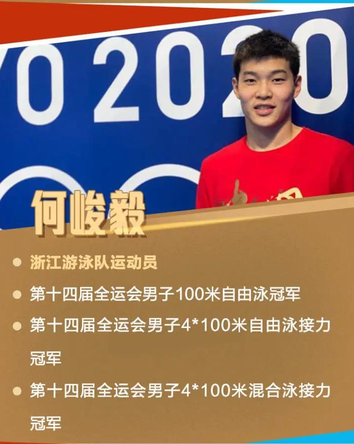 何峻毅为我校高水平运动员,就读于工商管理学院市场营销专业,曾代表中国队参加东京奥运会游泳比赛。在第十四届全运会中,何峻毅勇夺男子100米自由泳、男子4*100米自由泳接力、男子4*100米混合泳接力三项冠军。