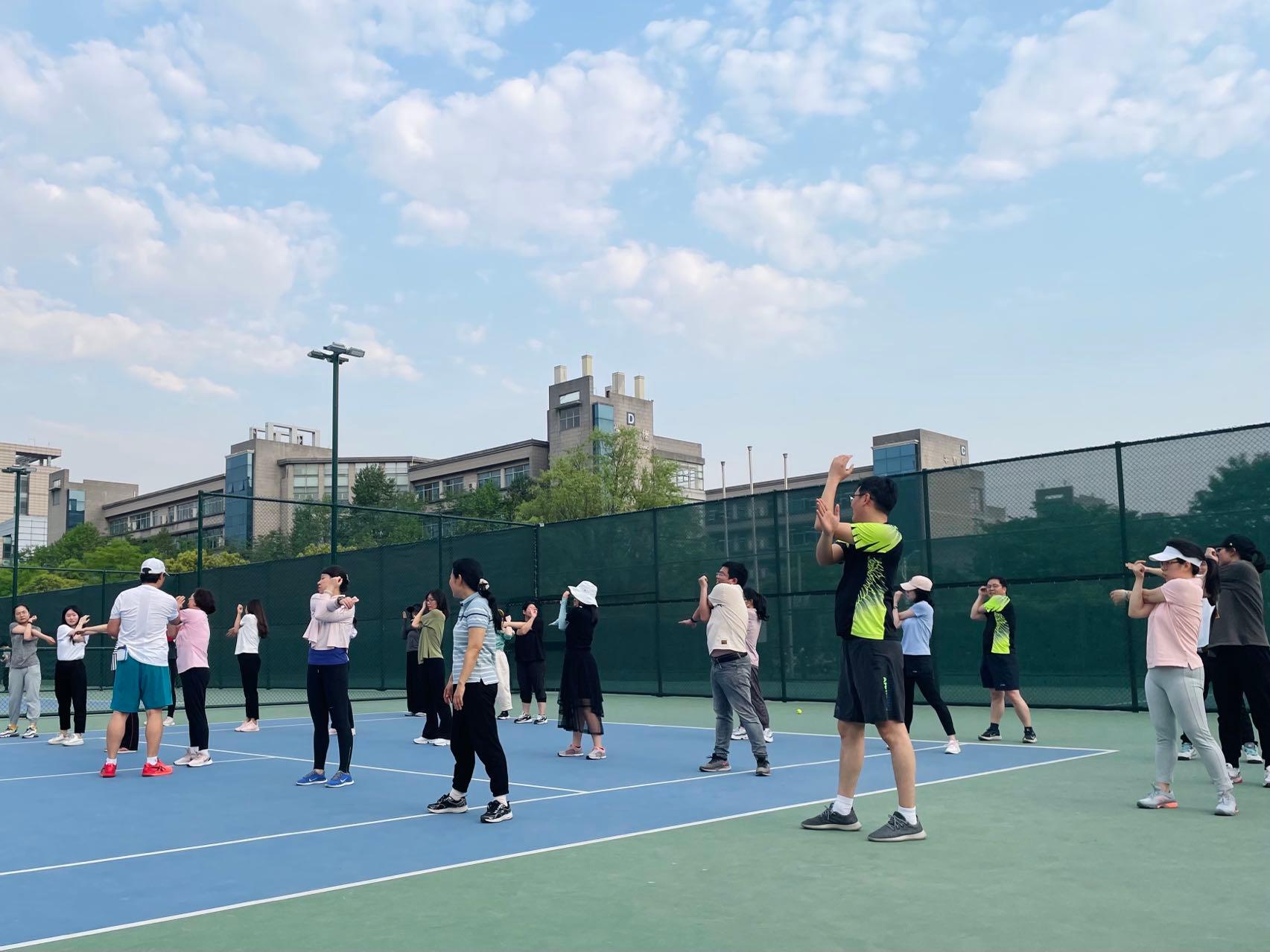 开课当日,骄阳似火,但教职工们兴高采烈、精神饱满,早早来到训练场,室外网球场上一片热火朝天的景象。在我部专任网球教师的带领下,教职工们先进行了课前的热身准备活动,然后开始握拍、站位、基本步伐、球感、正手击球等基础技能学习,参加的教职工们都能积极尝试和自主练习。这次网球培训课,教职工们不仅学习到了网球的入门基础,也感受到了“快乐网球”的运动乐趣,对这次培训收获满满。