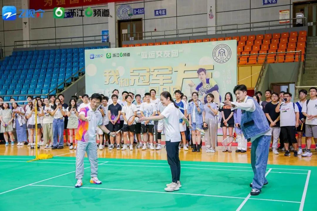 9月19日,“我和冠军是朋友”亚运交友团高校挑战赛第二站在我校下沙校区举行。全国羽毛球锦标赛冠军朱俊畅与我校学生互动切磋。校党委委员、副校长董进才,浙江电视台民生休闲频道总监钱群出席活动并开球。来自各学院百余名师生参加了本次活动。