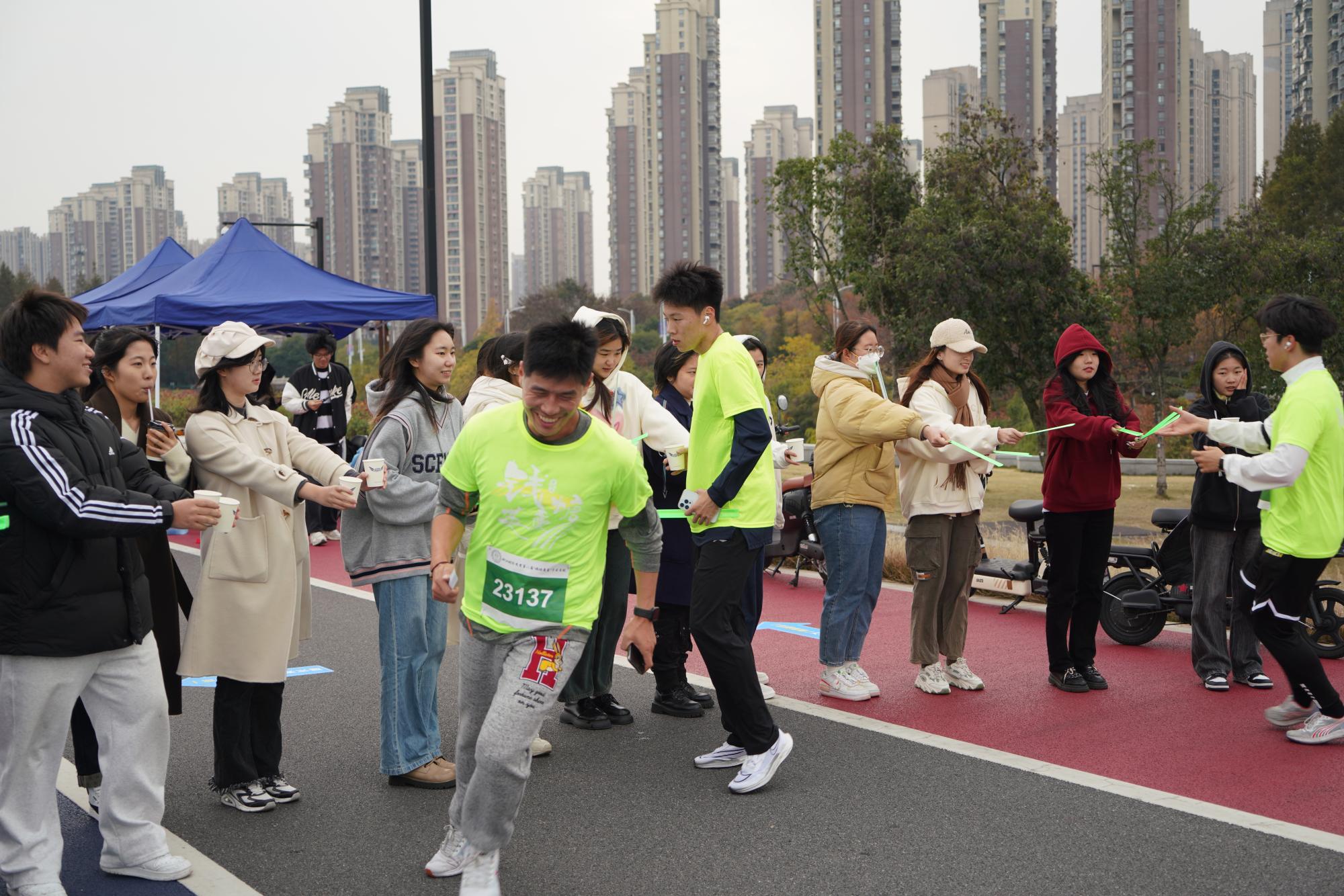 Spinning体育舞蹈协会舞蹈《Latin girl》和校流音工作室的歌曲《造亿万顿光芒》为万米长跑营造了热情活泼的氛围,冬日校园热血沸腾,钱塘江畔激情四射。随后,竞技组、教职工组、大众组依次出发,沿开车漫画