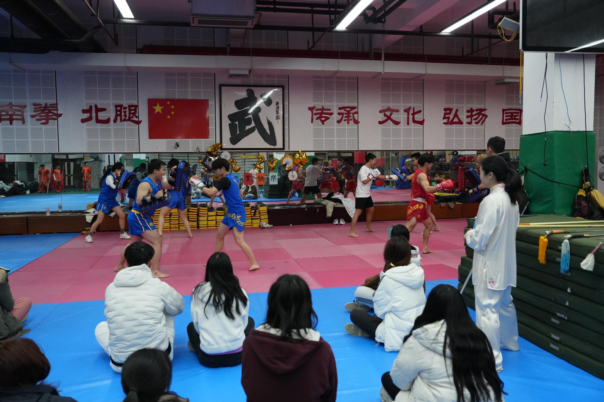 随后,刀、枪、剑、棍、南拳、对练、集体项目、散打……校武术队的精彩表演赢得阵阵掌声和喝彩。通过理论讲解及实践技术的现场展示,美国学生对武术运动有了进一步的了解和认识,并激发出浓厚的兴趣。