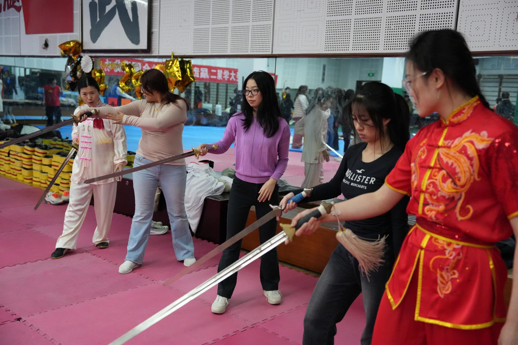 在杨连芳和应昌达老师的指导下,美国师生们集体学习了剑术和太极拳,随后根据兴趣与武术队队员自由交流。