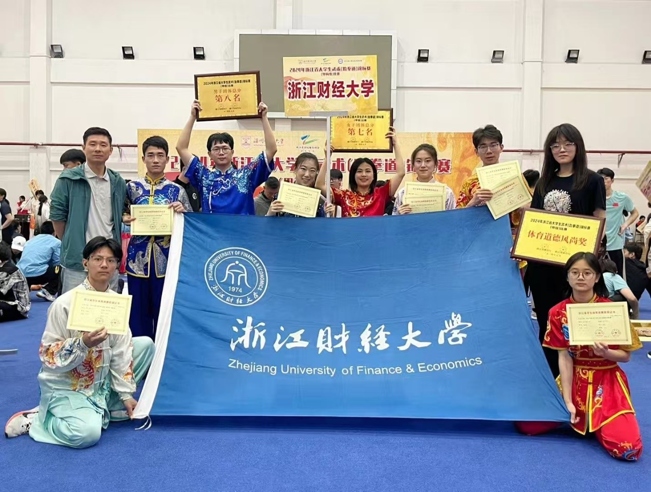 武术队建立于2001年,根据比赛需要开设武术套路项目、散打、太极推手和长短兵共四个项目。作为优秀传统强队,队员品学兼优,队风严谨优良,战绩硕果累累。在教练的悉心指导和队员的相互配合下,队员们能够持之以恒、坚持不懈的训练,不怕苦、不怕累、勇于向自己的极限挑战;队员之间能够团结友爱、互相关心、互相帮助,不轻言放弃,具有为财大增光的高度荣誉感。自建队以来,武术队在浙江省、全国以及国际竞赛中获得骄人的比赛成绩,共斩获74枚金牌,89枚银牌,66枚铜牌,总计376项前八奖项,同时获得多部门颁发的“最佳运动队”“体育道德风尚奖”“优秀代表队”等荣誉称号。