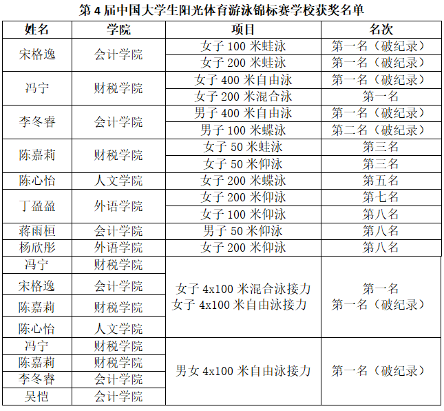 游泳健儿摘得8金1银2铜,获团体总分第一名、女子团体总分第一名、男子团体总分第五名。会计学院宋格逸同学打破女子100米蛙泳、女子200米蛙泳两项赛会纪录,会计学院李冬睿同学打破男子400米自由泳、男子100米蝶泳两项赛会纪录,财税学院冯宁同学打破女子400米自由泳赛会纪录,开车漫画