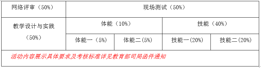 展示活动分网络评审与现场测试两环节,其中网络评审项目为教学(指导)设计与教学(指导)实践,现场测试项目为体能与专项技能。权重分配见下表: