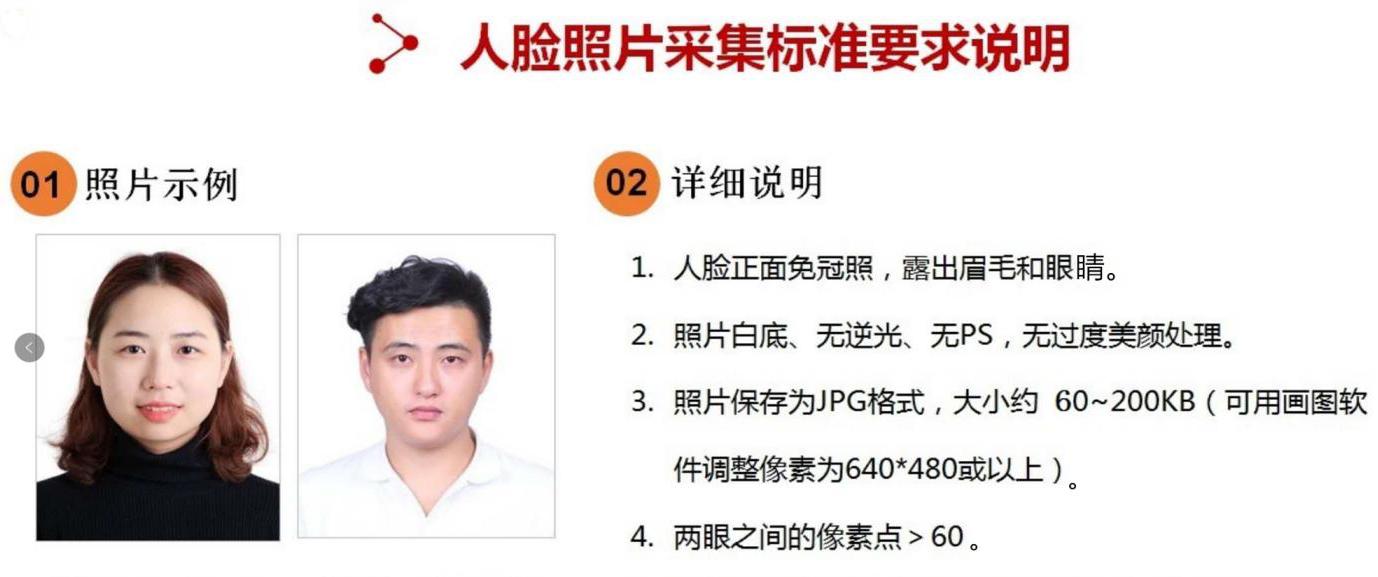 为提高识别率,拍照时请将头发梳理至耳后,摘掉眼镜和帽子,正面拍照,拍照背景颜色单一,不能用手机直接拍摄原有照片,避免强光和黑暗环境中采集。