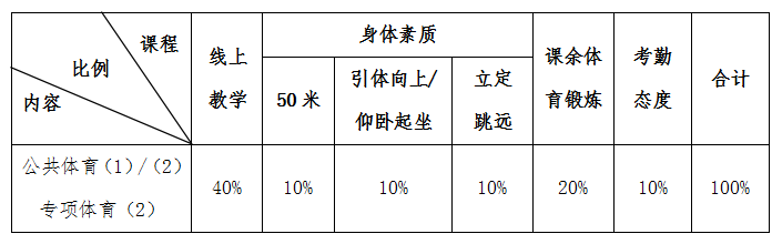 素质项目测试标准参照学生体质健康测试标准,三项素质成绩即是本学期体育单项成绩,也将作为学生下学年体质健康测试成绩。