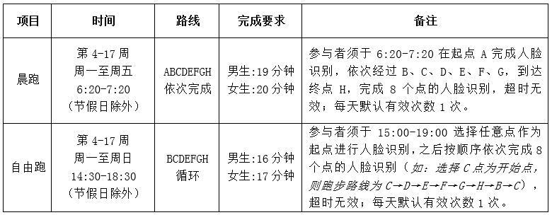 为落实体质健康促进工程,加强课余体育锻炼管理,经研究决定于2022-2023学年第一学期第4-17周(因设备移动、路线调整、机器调试等问题无法如期开始,开始时间延迟一周)开展课余体育锻炼。课余体育锻炼占【体育课程】总成绩18分,且为【体育锻炼】第二课堂素质课堂的必选内容及健身课堂的自选内容,实施人脸识别,过程中如有问题可在创高体育APP上进行反馈,望各学院、各班级组织同学积极参加。