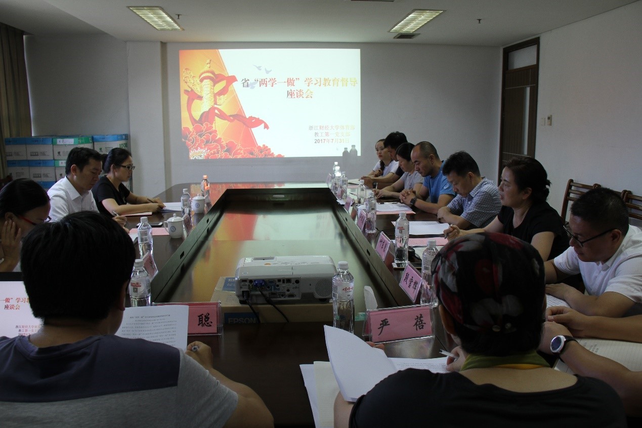教工第一党支部部分党员同志展开座谈,校党委副书记卢新波同志、校组织部副部长段雪辉等同志陪同。
