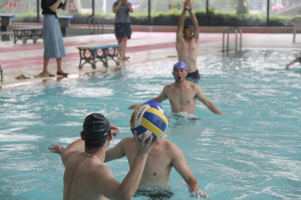 本次水上健身系列活动包括蛙泳接力(50M)、水上排球、池底捞宝、定格一瞬四个项目。活动第一项是50M蛙泳接力赛,比赛还未开始,泳池边已呈现一片欢乐沸腾的景象,选手们个个摩拳擦掌、舒展筋骨,做足赛前热身运动,欲一展矫健身手。第二项水上排球赛将活动的气氛推向了高潮,随着裁判一声令下,双方队员的焦点都聚集在排球上,泳池瞬间被激荡起无数浪花,现场呐喊声、欢呼声不断,场面热闹非凡。第三项池底捞宝,考验参赛者的憋气能力,参赛者需要一次潜水捞池底的鹅卵石,捞到鹅卵石多者为胜。各队派出的队员各显神通,有水下吸尘器般横扫池底者,也有美人鱼般姿势优美者,让大家连连赞叹。定格一瞬这个项目伴随着整个比赛,各种精彩瞬间被大家的相机、手机所捕捉,在活动结束后制作成微电影,留下这美好的回忆。